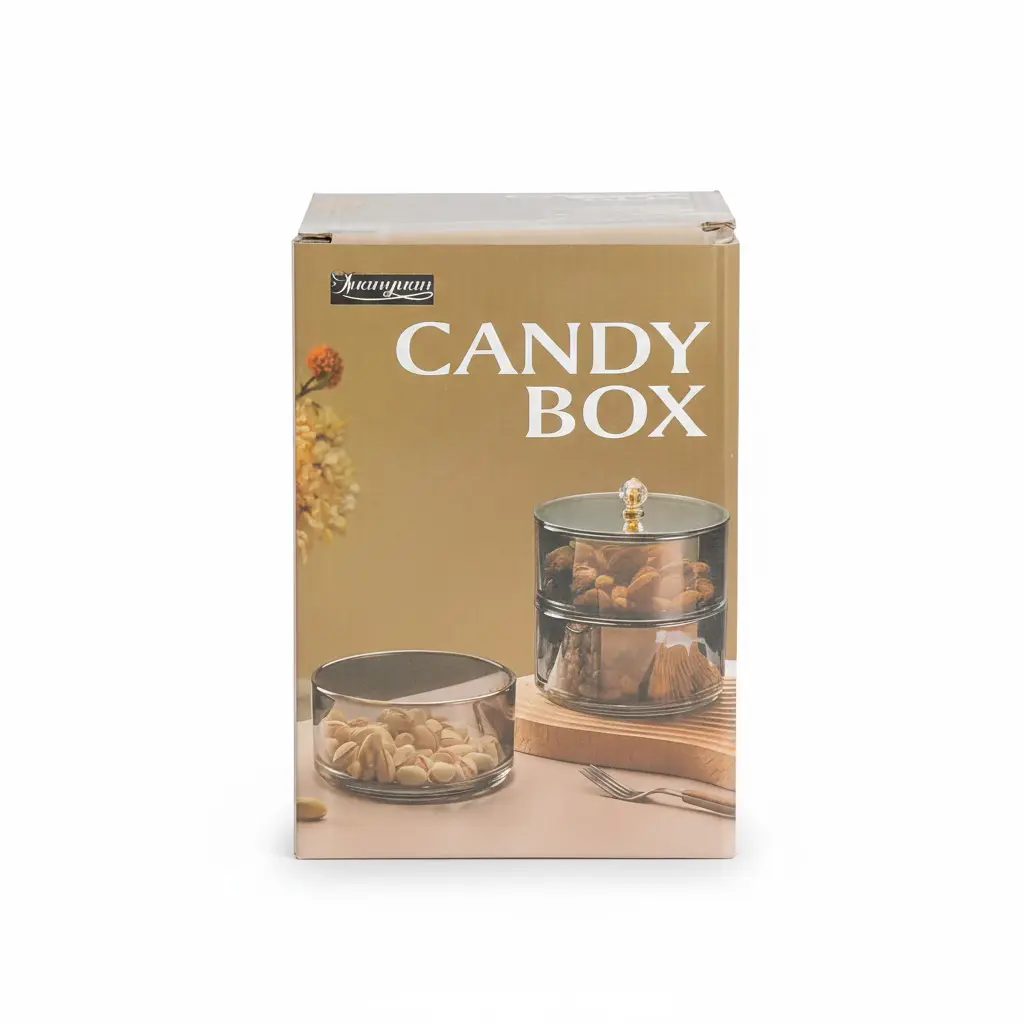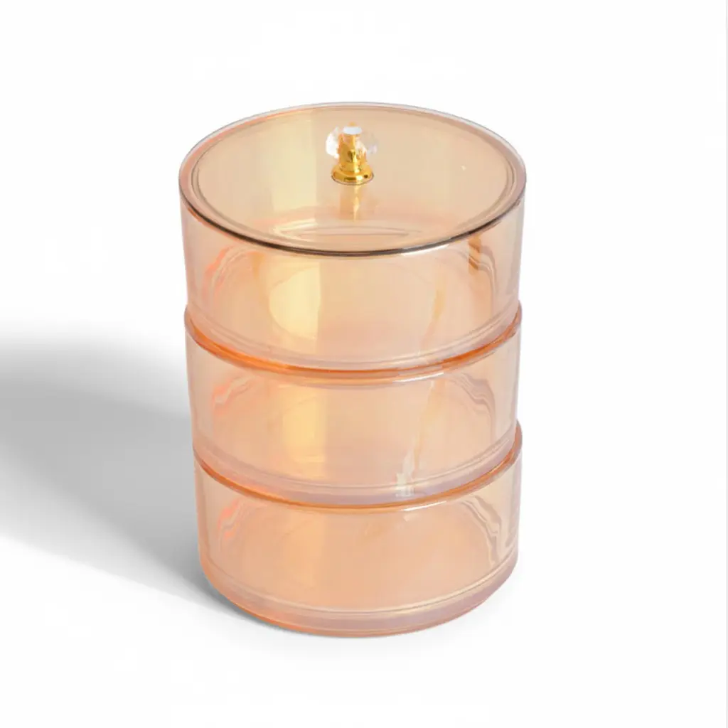 این باکس با طراحی طبقاتی و مدرن به رنگ عسلی شفاف ساخته شده است که جلوه‌ای بسیار زیبا و لوکس به میز پذیرایی یا آرایش شما می‌بخشد. ساختار استوانه‌ای و شفاف این محصول اجازه می‌دهد تا محتویات داخل آن به خوبی دیده شود و برای نگهداری انواع جواهرات، لوازم آرایشی خرد و یا حتی سرو انواع آجیل و شیرینی در محیط‌های مختلف کاربرد دارد. درب این محصول مجهز به یک دستگیره ظریف و درخشان است که علاوه بر سهولت در باز و بسته کردن، از نفوذ گرد و غبار یا آلودگی به فضای داخلی جلوگیری کرده و نظم خاصی به چیدمان وسایل شما می‌دهد.