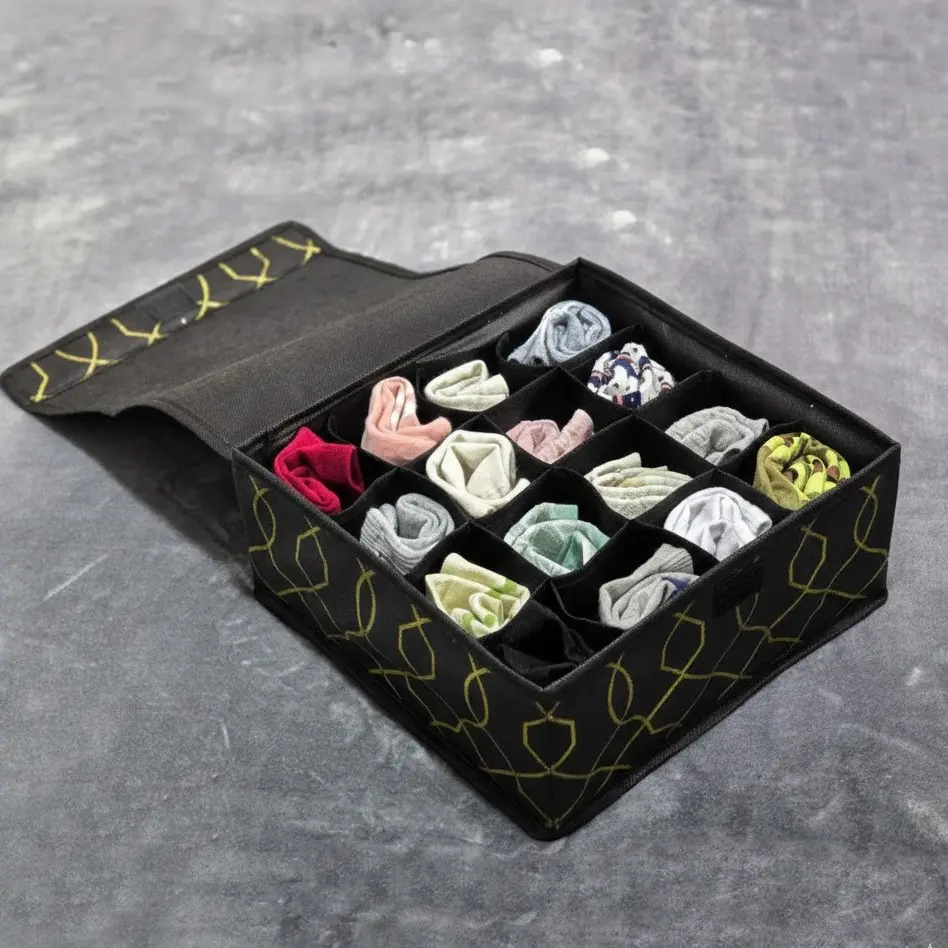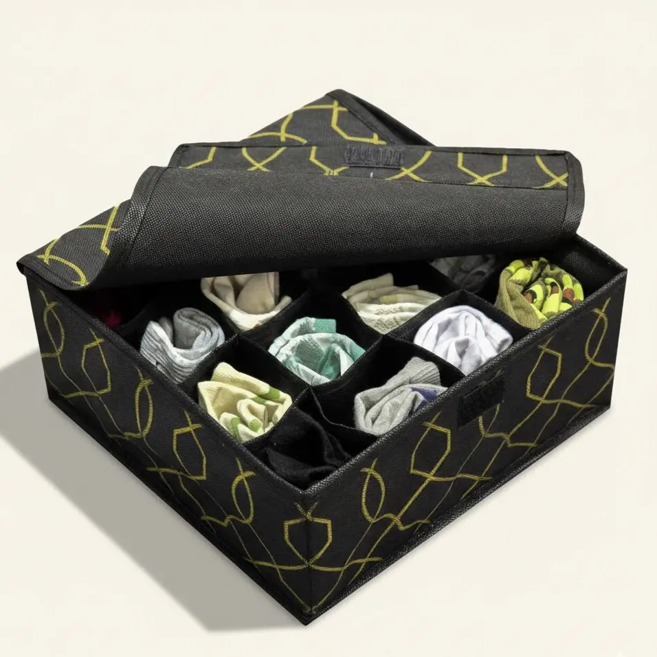این محصول یک جعبه نظمدهنده کاربردی با طراحی تاشو است که برای مرتبسازی لباسهای کوچک مانند جوراب، لباس زیر و اکسسوریها در داخل کمد یا کشو طراحی شده است. بدنه این باکس دارای پارچهای با رنگ تیره و طرحهای هندسی طلایی است که ظاهری شیک به فضای داخلی کمد شما میبخشد. استفاده از این نظمدهنده به شما کمک میکند تا از فضای محدود خود به بهترین شکل استفاده کرده و به راحتی و در کمترین زمان ممکن، وسیله مورد نظر خود را پیدا کنید.