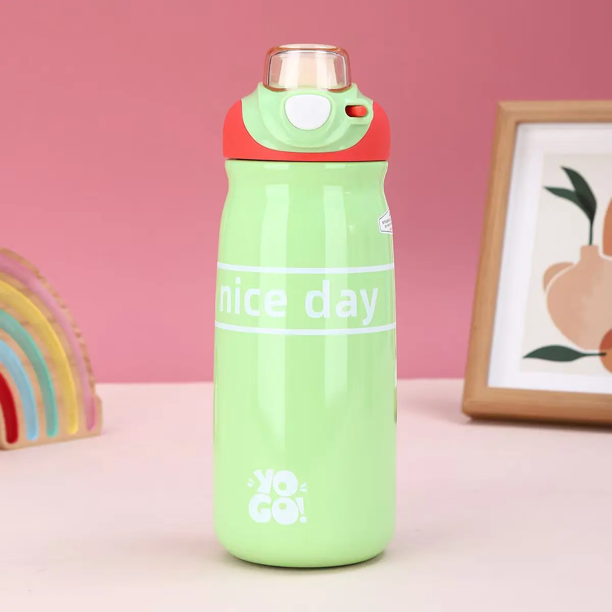 این محصول یک بوتل آب فانتزی و جذاب است که با رنگ سبز روشن و طراحی کودکانه، برای استفاده در مکتب، کودکستان و فعالیت‌های بیرون از خانه طراحی شده است. بدنه این بوتل دارای یک نوار پهن با عبارت "day" است که ظاهری مدرن و اسپرت به آن بخشیده و به دلیل ابعاد مناسب، به راحتی در بکس پشتی یا دست‌های کوچک کودکان جای می‌گیرد. این بوتل همراه با یک بند یا دسته مخصوص در قسمت بالایی ارائه شده است که حمل و نقل آن را برای کودکان در هنگام حرکت بسیار ساده و لذت‌بخش می‌سازد.