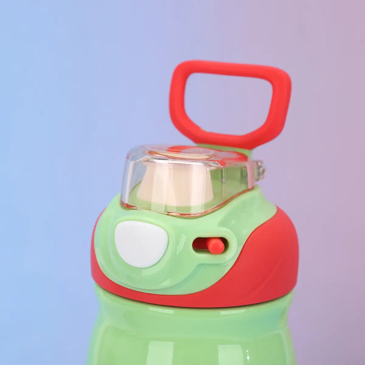 این بوتل از مواد پلاستیکی مقاوم و بهداشتی ساخته شده و دارای یک درب محافظ به رنگ سرخ است که با یک دکمه فشاری به راحتی باز و بسته می‌شود. طراحی درب آن به گونه‌ای است که از نشت مایعات جلوگیری کرده و مجهز به یک سرپوش شفاف برای حفظ پاکیزگی قسمت دهانه می‌باشد. این محصول دارای یک دسته پلاستیکی ارگونومیک در قسمت فوقانی است که امکان آویزان کردن یا حمل آسان را فراهم می‌کند و به دلیل ساختار محکم خود، در برابر ضربه‌های احتمالی در محیط‌های آموزشی و تفریحی دوام خوبی دارد.