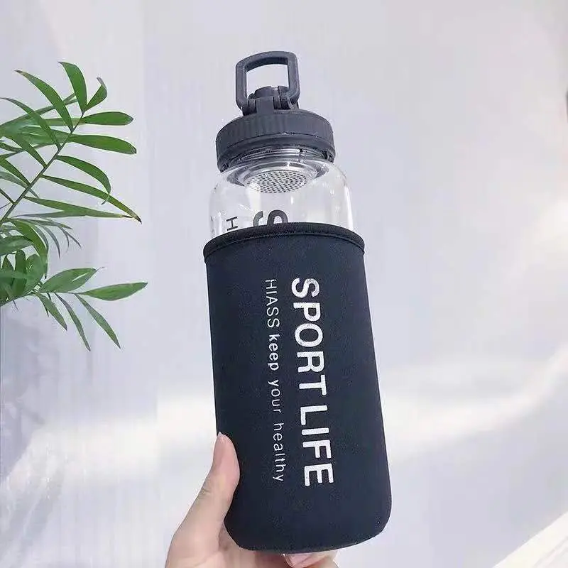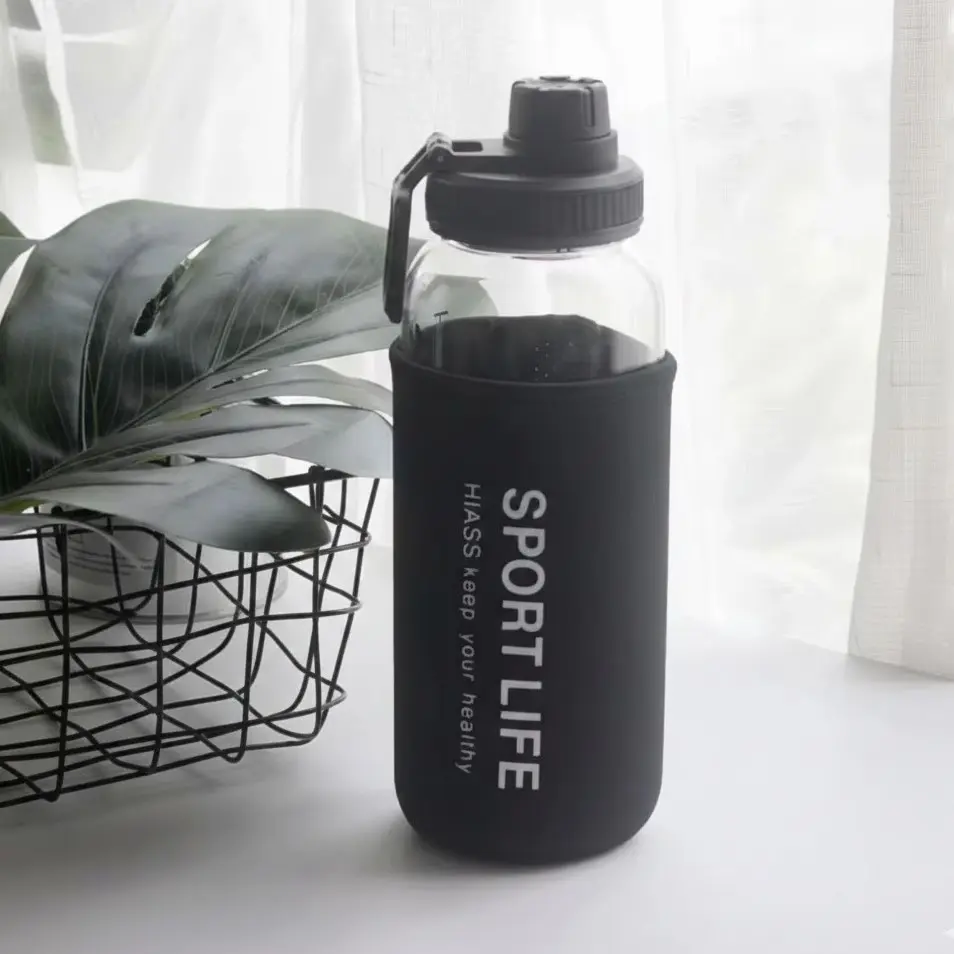 این بوتل ورزشی با طراحی مدرن و کاربردی، یک انتخاب عالی برای ورزشکاران و افرادی است که به سلامتی خود اهمیت می‌دهند. بدنه اصلی این محصول شفاف بوده و توسط یک پوشش محافظ پارچه‌ای به رنگ سیاه احاطه شده است که علاوه بر زیبایی، به نگهداری بهتر و جلوگیری از لغزش بوتل در دست کمک می‌کند.