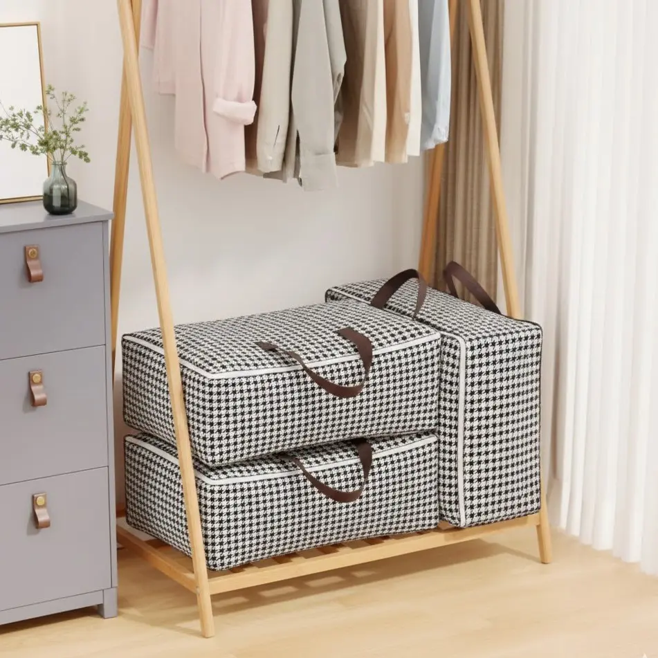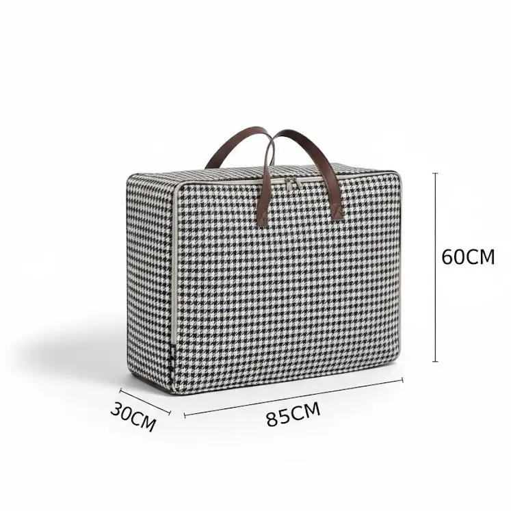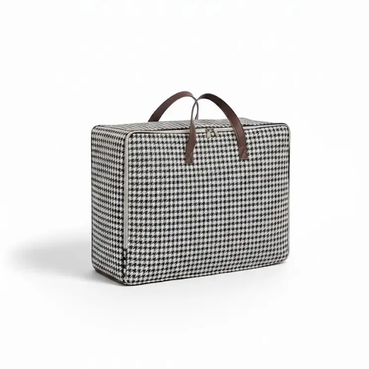 وقتی به تصویر نگاه می‌کنید، طرح چهارخانه ریز سیاه و سفید (Houndstooth) این بیک‌ها جلوه‌ای بسیار شیک و کلاسیک به آن‌ها بخشیده است که با هر دکوراسیونی ست می‌شود. برخلاف کیسه‌های نایلونی یا کارتنی که نمای اتاق را خراب می‌کنند، این ارگانایزرها مثل یک چمدان پارچه‌ای زیبا عمل می‌کنند. همانطور که در عکس دیده می‌شود، می‌توانید آن‌ها را به صورت افقی یا عمودی روی هم بچینید تا از فضای عمودی کمد نهایت استفاده را ببرید. ترکیب رنگ پارچه با دسته‌های چرمی‌شکل قهوه‌ای، حسی از کالای لوکس را منتقل می‌کند. با این محصول، نه تنها "ظرفیت کمد خود را ارتقا می‌دهید" (Upgrade capacity)، بلکه مشکل ذخیره‌سازی روزانه (Fix the daily storage) را با استایلی زیبا حل می‌کنید.