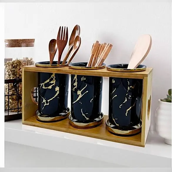 بدنه این ظروف از جنس سنگی با کیفیت با طرح ماربل تیره و رگه‌های طلایی ساخته شده است که شامل سه محفظه استوانه‌ای جداگانه می‌باشد. این ست مجهز به یک چوکات چوبی مستحکم است که ظروف را به طور منظم در کنار هم نگاه می‌دارد و زیر هر ظرف یک پایه فلزی طلایی برای زیبایی بیشتر تعبیه شده است. طراحی این محصول به گونه‌ای است که برای نگهداری انواع قاشق، پنجه، کارد و حتی وسایل چوبی آشپزخانه فضای کافی و تفکیک شده‌ای را فراهم می‌آورد.