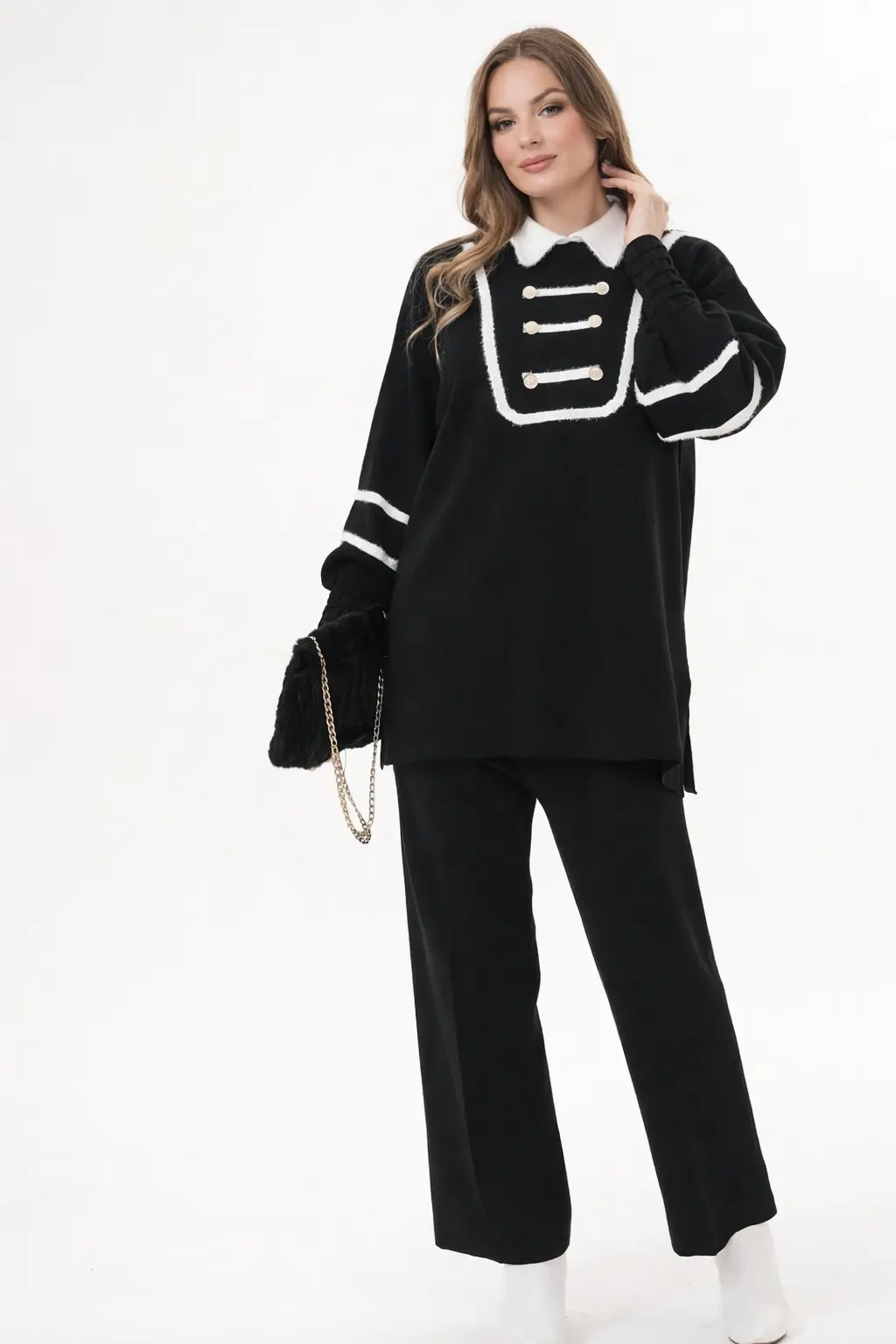 این ست دوتکه مجلل با رنگ مشکی عمیق و تضاد خیرهکننده سفید، بازتعریفی مدرن از استایل کلاسیک است که با هدف ایجاد ظاهری اشرافی و متمایز برای بانوان خوشسلیقه طراحی گردیده است؛ بلوز بافت این مجموعه با یقه پیترپن (ببنی) سفید و کرکدار در کنار طرح تزیینی سینه با دکمههای افقی آراسته شده که با خطوط سفید روی آستینها، جلوهای بسیار شیک و هماهنگ به استایل شما میبخشد تا در هر محیطی به عنوان نمادی از اصالت شناخته شوید. علاوه بر آن، این پوشش با بهرهگیری از بافت منسجم و الیاف مرغوب، علاوه بر حفظ گرمای مطلوب در روزهای سرد، تنپوشی بسیار سبک و لطیف را فراهم میآورد که در تمام طول روز حسی از اعتماد به نفس و آرامش را به شما منتقل میسازد و جایگاهی ویژه در کمد لباسهای لوکس شما خواهد داشت.