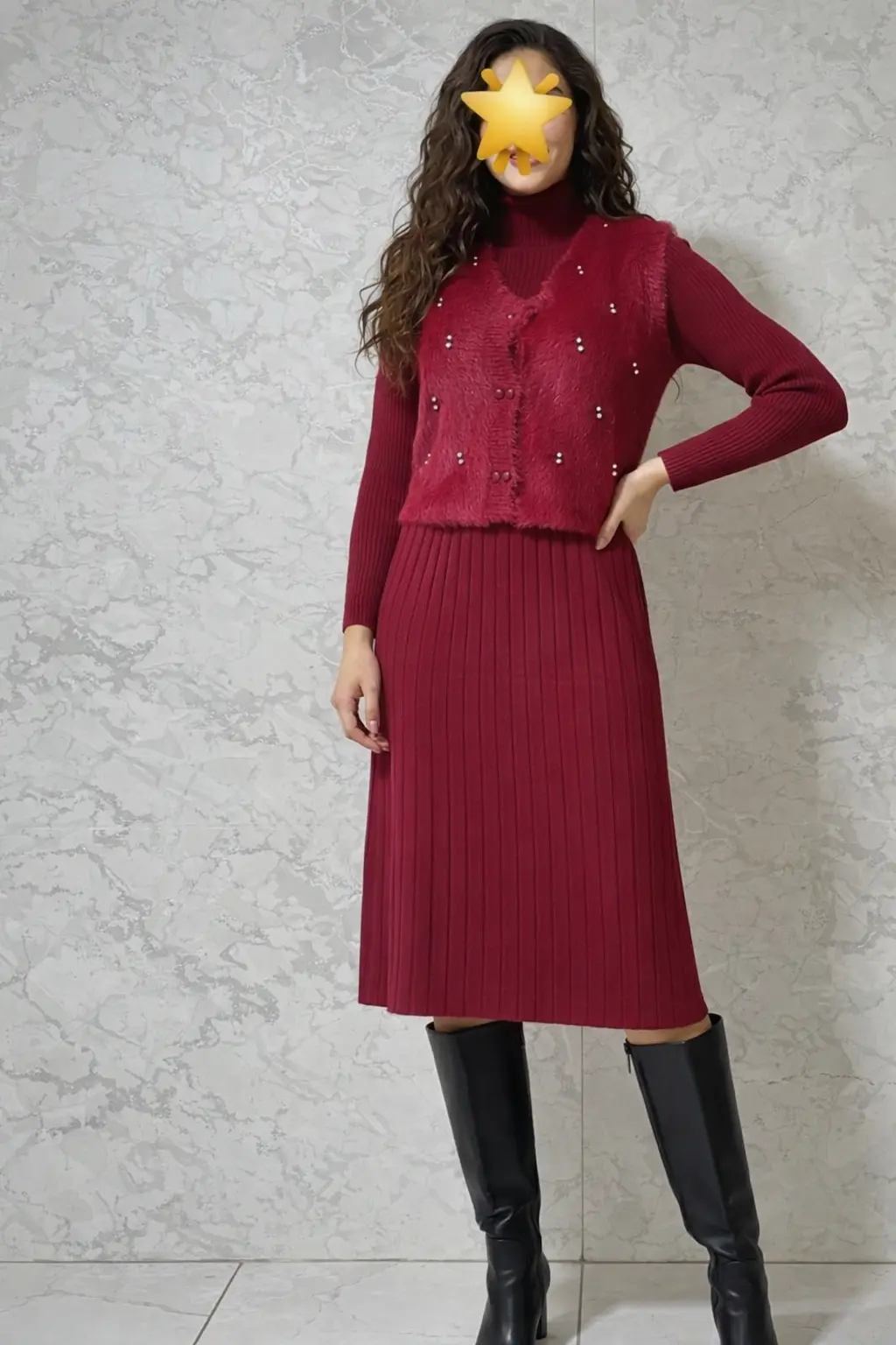 این ست دو‌تکه مجلل با رنگ زرشکی عمیق و گرم، تجسمی از وقار و زیبایی در طراحی مدرن لباس‌های زمستانی است که با هدف ایجاد تجربه‌ای متفاوت از شکوه و راحتی برای بانوان خوش‌سلیقه طراحی گردیده است؛ واسکت (جلیقه) ظریف و کرک‌دار که با چیدمان هنرمندانه مرواریدهای درخشان آراسته شده، در کنار پیراهن بافت یقه ایستاده با خطوط عمودی، جلوه‌ای اشرافی و منحصر‌به‌فرد به این اثر بخشیده است تا شما در هر محفلی به عنوان نمادی از اصالت شناخته شوید. علاوه بر آن، این پوشش با بهره‌گیری از بافت منسجم و الیاف مرغوب، علاوه بر حفظ گرمای مطلوب در روزهای سرد، تن‌پوشی بسیار سبک و لطیف را فراهم می‌آورد که در تمام طول روز حسی از اعتماد به نفس و آرامش را به شما منتقل می‌سازد و جایگاهی ویژه در کمد لباس‌های لوکس شما خواهد داشت.