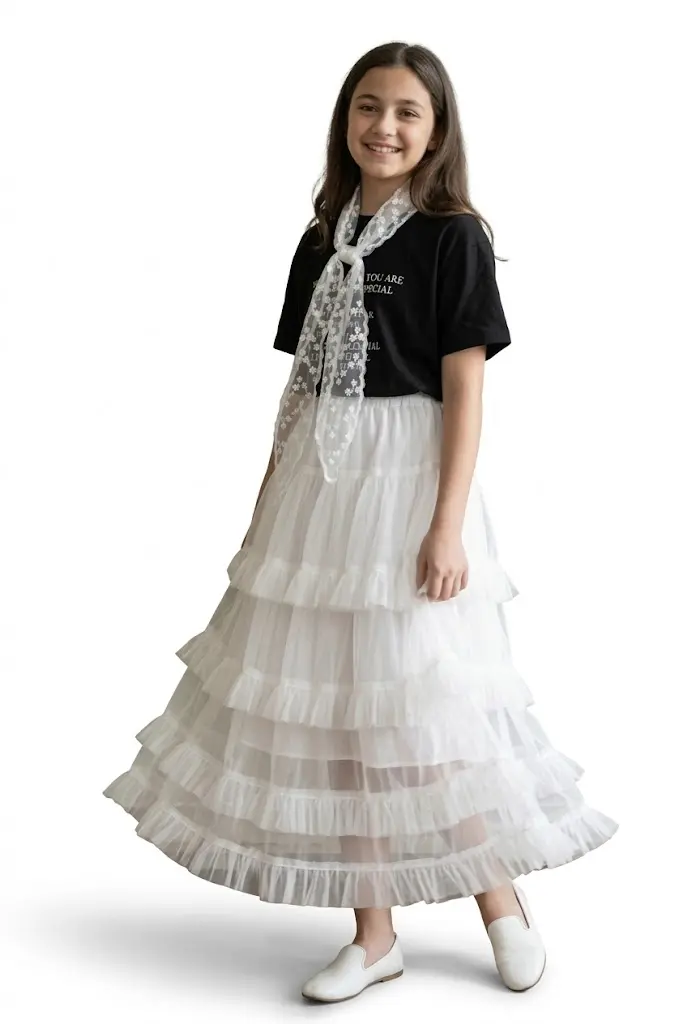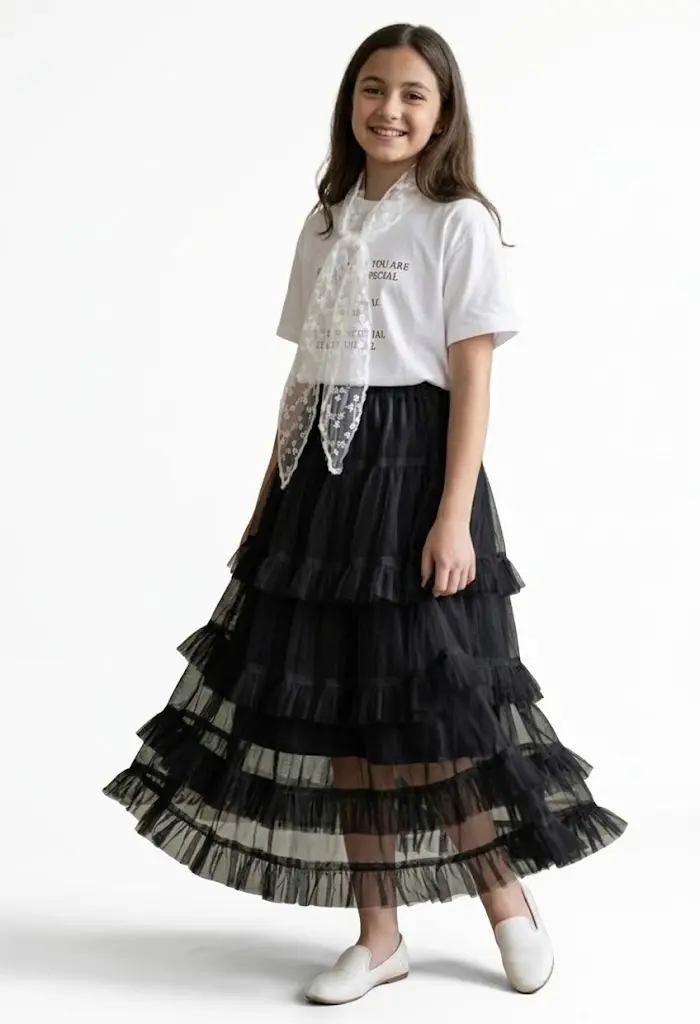 این ست دو تکه با تضاد رنگی سیاه و سفید کلاسیک، انتخابی رویایی و جسورانه برای دختران نوجوان در مهمانیهای مجلل، جشنهای تولد و مراسمهای خاص خانوادگی است. این لباس برای سنین ۶ سال الی ۱۴ سال بسیار مناسب بوده و به دلیل طراحی مدرن و دامن پرچین لایهای، جلوهای دوستداشتنی و باوقار به ظاهر فرزند شما میبخشد که ترکیبی از شیکپوشی بزرگسالانه و ظرافتهای دخترانه را به نمایش میگذارد. در این پوشش منحصربهفرد هماهنگی میان بلوز نخی تیره با نوشتههای طلایی ظریف و دامن بلند جالی (توری) که به صورت طبقهای طراحی شده، استایلی جذاب و متمایز را فراهم میسازد که با یک شال توری گرهخورده دور گردن، شکوه این استایل را به اوج میرساند.