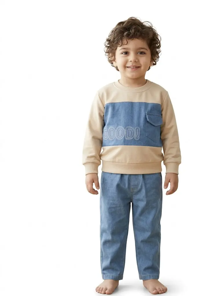این ست دو تکه با ترکیب رنگ خاکی ملایم و آبی جین روشن، انتخابی هوشمندانه برای روزهای دل‌انگیز بهاری و ایجاد استایلی کژوال و مدرن برای پسران خوش‌پوش است. این لباس برای سنین ۱ سال الی ۶ سال بسیار مناسب بوده و به دلیل طراحی به‌روز و استفاده از پارچه‌های باکیفیت، جلوه‌ای دوست‌داشتنی و باوقار به ظاهر فرزند شما می‌بخشد که برای حضور در جمع‌های خانوادگی و گشت‌وگذارهای عصرانه عالی است. در این پوشش منحصر‌به‌فرد هماهنگی میان بلوز دورس که با یک پنل جین در وسط سینه و نوشته گلدوزی شده "GOOD" آراسته شده و پتلون جین هماهنگ با آن، استایلی جذاب و متمایز را فراهم می‌سازد که به راحتی با هر نوع کفش اسپرت ست می‌شود.