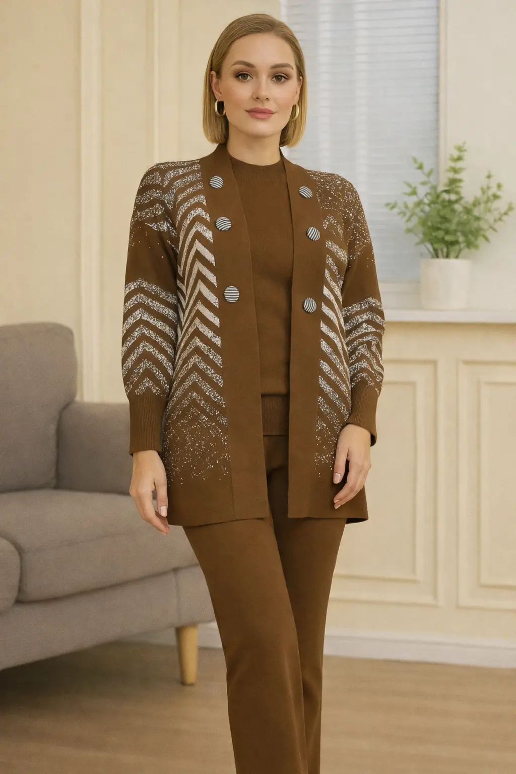 این ست سه‌تکه باشکوه با تناژ قهوه‌ای گرم و دلنشین، ترکیبی بی‌نظیر از هنر بافتنی و استایل مدرن است که با هدف ارائه پوششی لوکس و در عین حال راحت برای بانوان خوش‌سلیقه در فصول سرد طراحی شده است؛ ژاکت (کاردگان) بلند این مجموعه با طرح‌های هندسی ظریف و درخشان آراسته شده که در کنار بلوز یقه گرد و شلوار متناسب، توازنی بصری و چشم‌نواز ایجاد می‌کند تا شما در موقعیت‌های مختلف به عنوان فردی با استایل اصیل و منسجم درخشیده و حسی از برتری را تجربه نمایید. این مجموعه با بهره‌گیری از الیاف باکیفیت و بافتی نرم، علاوه بر تامین گرمای مورد نیاز، تن‌پوشی بسیار سبک را به ارمغان می‌آورد که در تمام طول روز آزادی عمل کاملی به شما بخشیده و به عضوی جدانشدنی از کمد لباس‌های کاربردی و شیک شما تبدیل خواهد شد.
