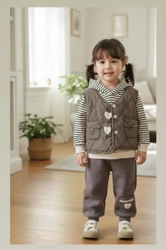 این ست لباس بسیار شیک و چند منظوره شامل یک جاکت آستینبلند با طرح خطهای افقی، یک واسکت پفکی (دبل) با جزئیات تزئینی قلبیشکل و یک پتلون هماهنگ است که برای راحتی و گرمای بیشتر کودکان طراحی شده است. طبق اطلاعات درج شده در تصویر، این محصول برای ردههای سنی ۱ سال، ۲ سال، ۳ سال، ۴ سال و ۵ سال کاملاً مناسب میباشد. طراحی این مجموعه به گونهای است که واسکت رویی با دکمههای فانتزی و جیبهای کاربردی، استایلی مدرن و جذاب را برای فرزند شما در روزهای خنک فراهم میآورد.