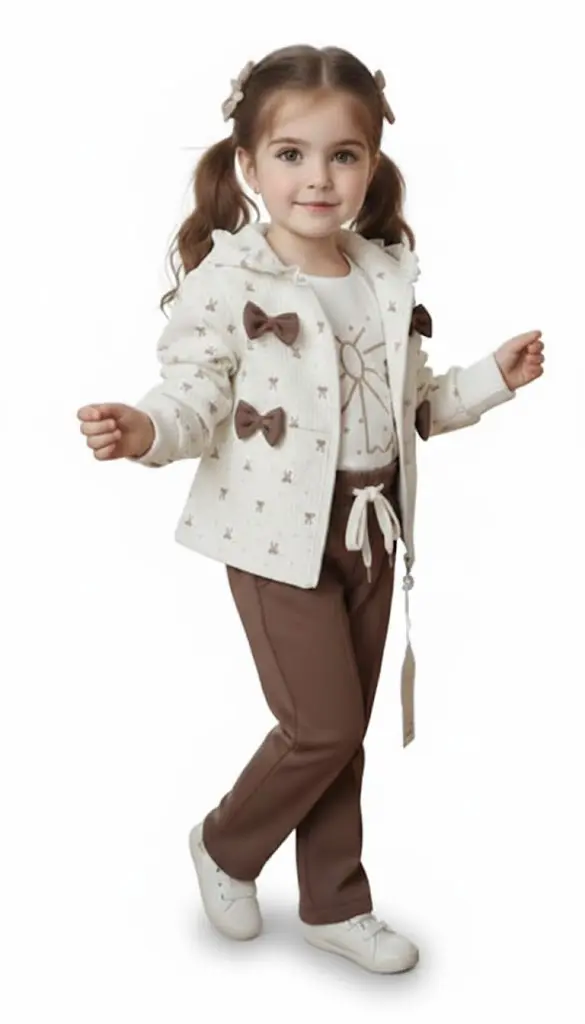 این ست لباس جدید و شیک دخترانه برای رده سنی ۲ سال الی ۵ سال طراحی شده است و شامل سه بخش هماهنگ برای ایجاد یک استایل کامل و جذاب میباشد. طراحی این مجموعه با بهرهگیری از رنگهای ملایم و تزئینات پاپیونی قهوهای بر روی ژاکت، ظاهری آراسته به کودکان میبخشد که برای استفاده در مهمانیها و گشتوگذارهای روزانه بسیار مناسب است.
