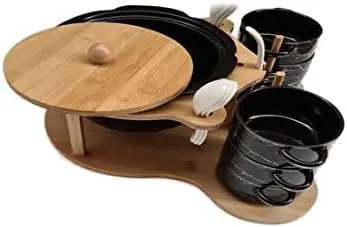 بدنه این ظروف از جنس سرامیک مرغوب با طرح ماربل مشکی و رگههای طلایی ساخته شده است که دارای مقاومت مناسب در برابر حرارت میباشد. این ست شامل یک قابلمه بزرگ سوپ با درپوش چوبی و شش عدد کاسه دستهدار هماهنگ است که همگی بر روی یک چوکات (استند) چوبی مستحکم و طبقاتی قرار میگیرند. همراه با این مجموعه، یک ملاقه بزرگ و شش عدد قاشق سرامیکی سفید نیز ارائه میشود تا پکیج پذیرایی شما کامل باشد. طراحی عمودی استند باعث میشود تا تمامی اجزا در کمترین فضای ممکن و با نظمی فوقالعاده در کنار هم قرار گیرند.