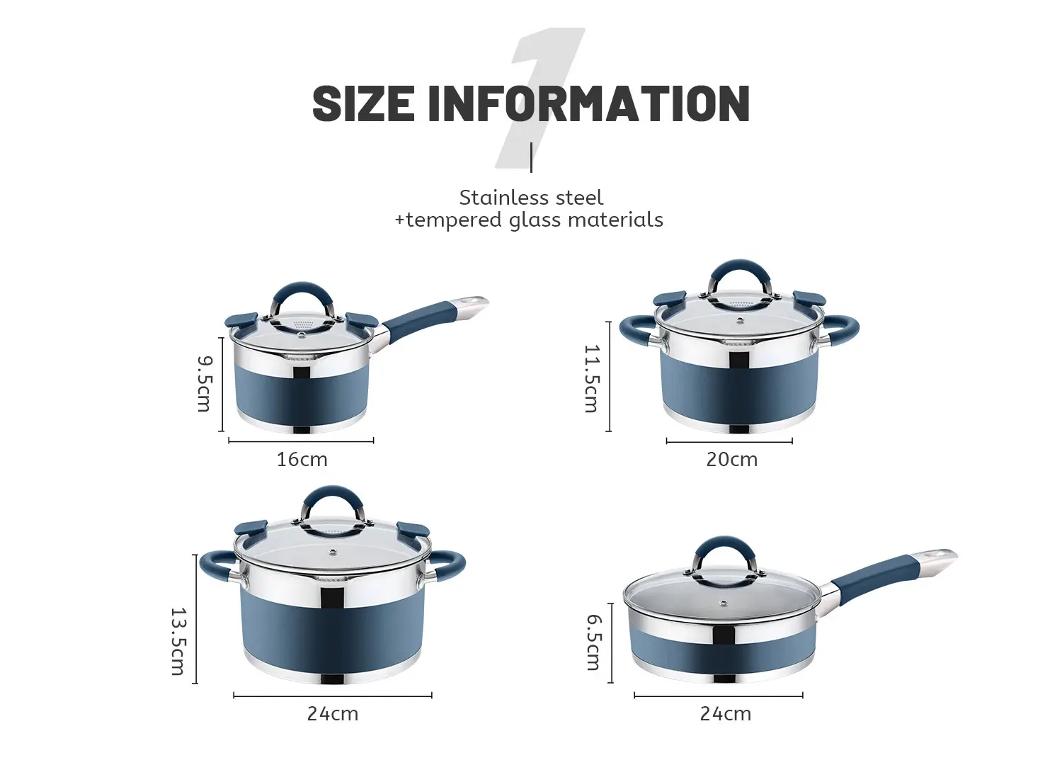 ست ظروف آشپزی از جنس استیل ساخته شده و دارای طراحی به سبک آمریکایی است. این مجموعه شامل قابلمه و سسدان در اندازههای ۱۶، ۲۰ و ۲۴ سانتیمتر میباشد. دستگیرههای این ظروف نیز از جنس استیل ساخته شدهاند که زیبایی و دوام بیشتری به مجموعه میبخشد. دربهای این ست از شیشه نشکن ساخته شدهاند تا فرآیند پخت و پز به وضوح قابل مشاهده باشد. کف این ظروف از نوع پایه القایی است که عملکرد بهینهای در اجاقهای القایی ارائه میدهد. وزن ناخالص مجموعه ۸.۰۰۰ کیلوگرم بوده و ابعاد بسته تکی آن ۴۸ سانتیمتر طول، ۴۸ سانتیمتر عرض و ۳۶ سانتیمتر ارتفاع است.