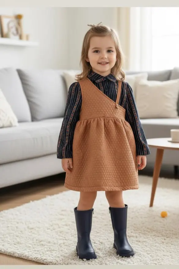 این ست لباس بسیار شیک و کاربردی شامل یک پیراهن سارافونی با بافت برجسته به رنگ قهوه‌ای و یک بلوز آستین‌بلند (یخ‌قاق) با طرح‌های سنتی ظریف در زمینه سرمه‌ای است. با توجه به اطلاعات موجود، این محصول برای رده‌های سنی ۲ سال، ۳ سال، ۴ سال، ۵ سال و ۶ سال تهیه شده است. طراحی این لباس به گونه‌ای است که ترکیب هماهنگی میان استایل کلاسیک و راحتی روزمره ایجاد می‌کند و برای فصل‌های خنک سال انتخابی بسیار مناسب به نظر می‌رسد.