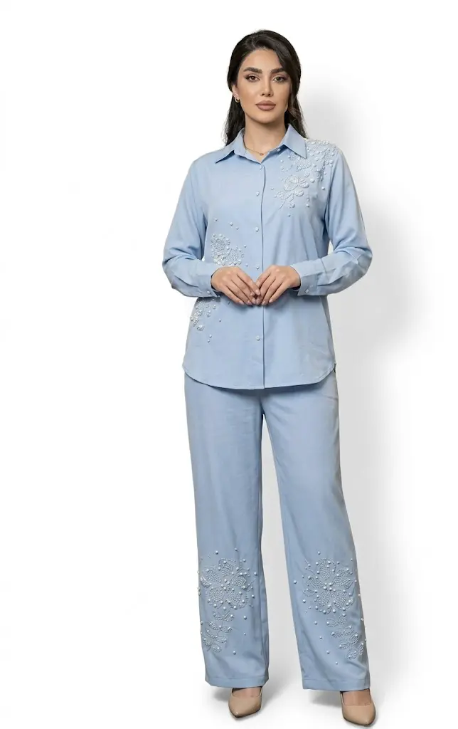این لباس به صورت فریسایز طراحی شده و برای خانمهایی با حداقل قد ۱۶۵ سانتیمتر بسیار مناسب است. این ست دو تکه زنانه شامل یک یخنقاق (بلوز دکمهدار) آستین بلند و شلوار هماهنگ به رنگ آبی روشن است که با تزئینات ظریف مرواریددوزی در قسمت تنه و پایین شلوار، جلوهای خاص و متمایز دارد. با توجه به استایل و ظاهر لباس در تصویر، این محصول برای رده سنی بزرگسال طراحی شده است.