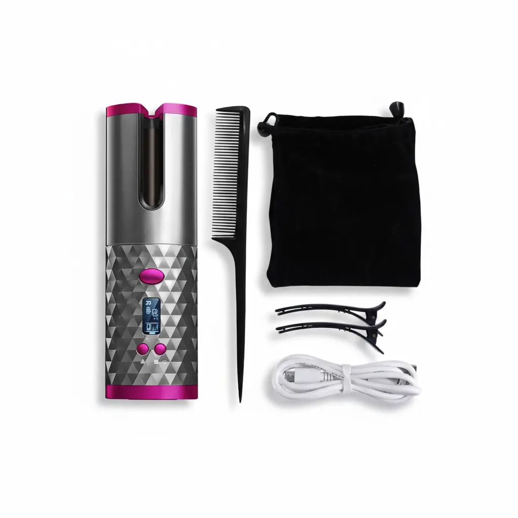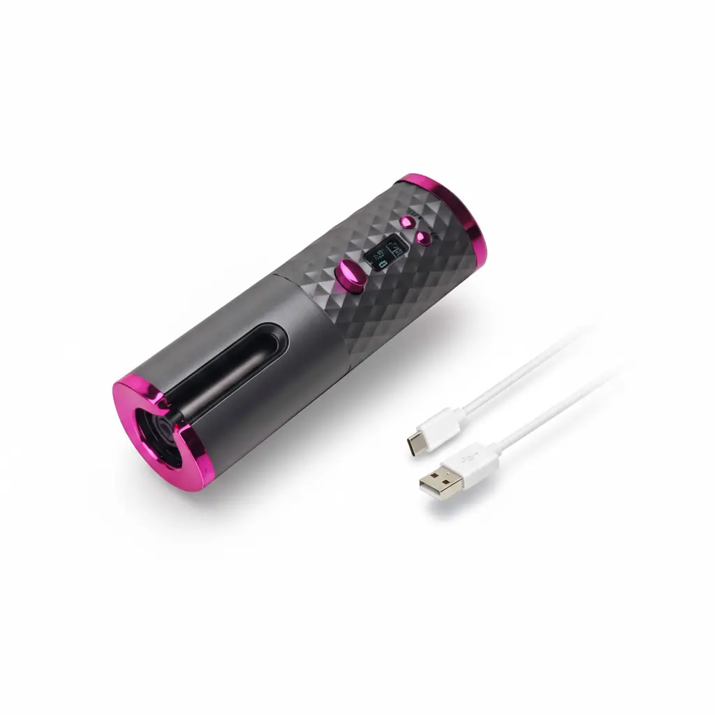 ظاهر این دستگاه با ترکیب رنگ خاکستری و صورتی و بدنه طرحدار هندسی، بسیار شیک و مدرن است. همانطور که در تصویر میبینید، روی بدنه یک صفحه نمایشگر دیجیتال وجود دارد که احتمالاً میزان حرارت، جهت چرخش یا میزان شارژ باتری را نشان میدهد تا کنترل دقیقی روی کار خود داشته باشید. استفاده از آن بسیار ساده است؛ کافیست دسته کوچکی از مو را داخل محفظه صورتی بالای دستگاه قرار دهید تا دستگاه به صورت خودکار مو را به دور خود بپیچد و فر کند. این دستگاه بسیار سبک و قابل حمل است و به راحتی در کیف دستی جای میگیرد، بنابراین میتوانید حتی در سفر و مهمانیها نیز موهایی خوشحالت و جذاب داشته باشید.