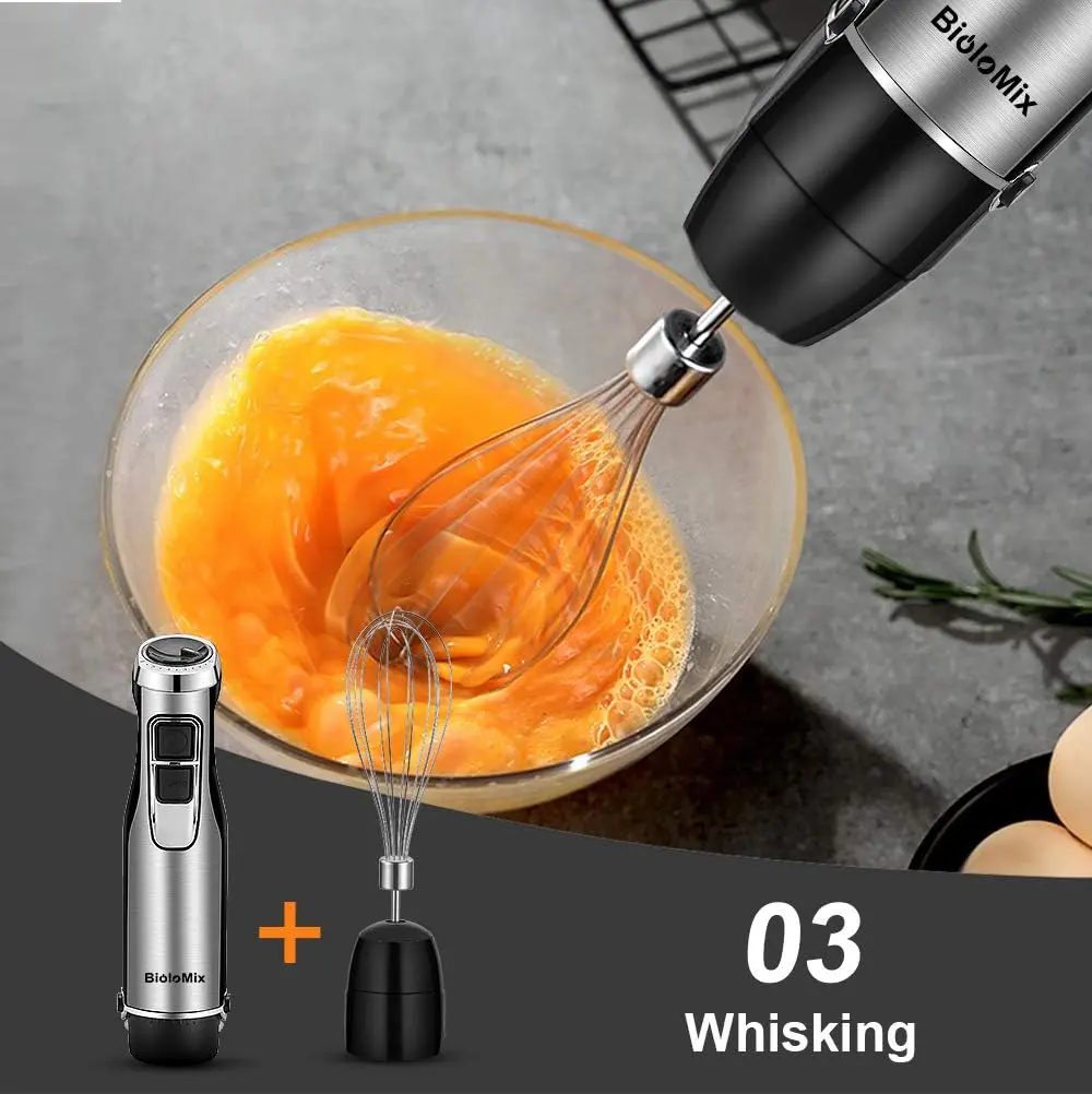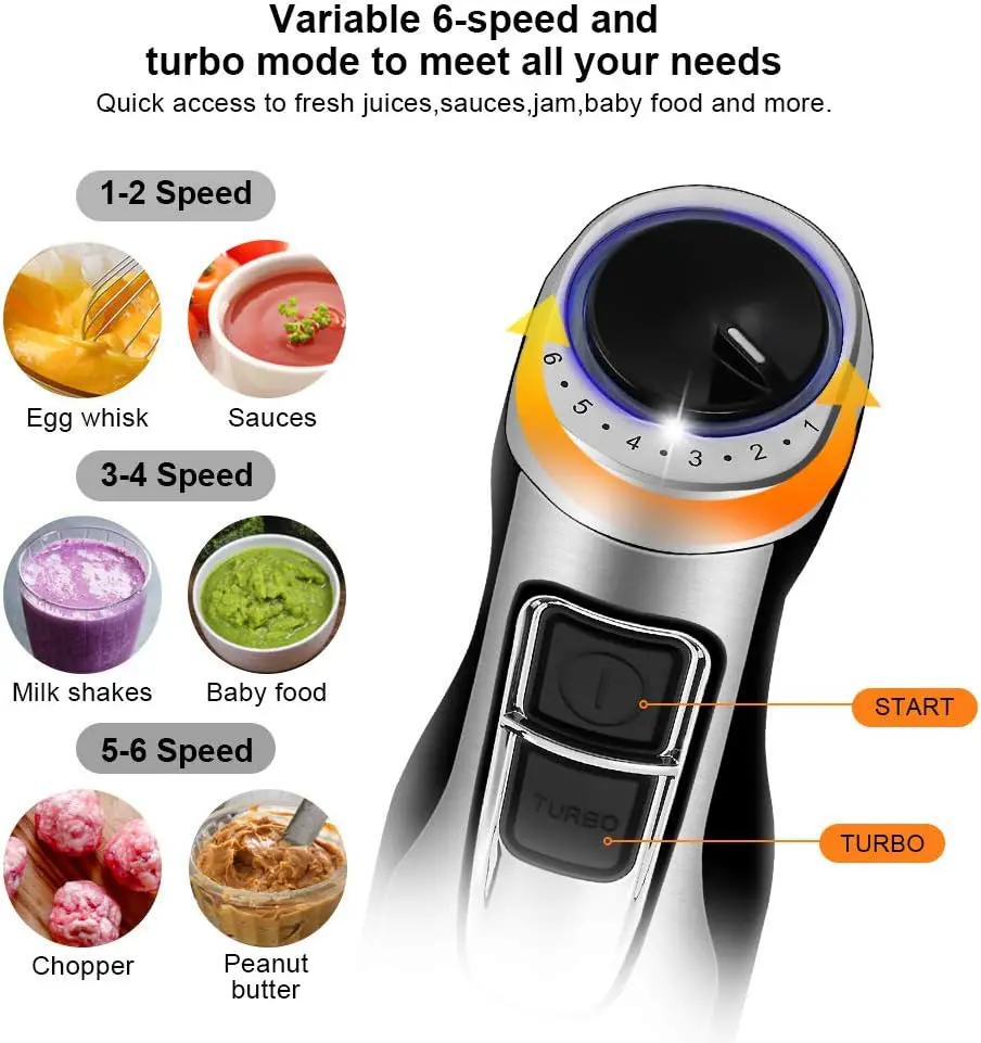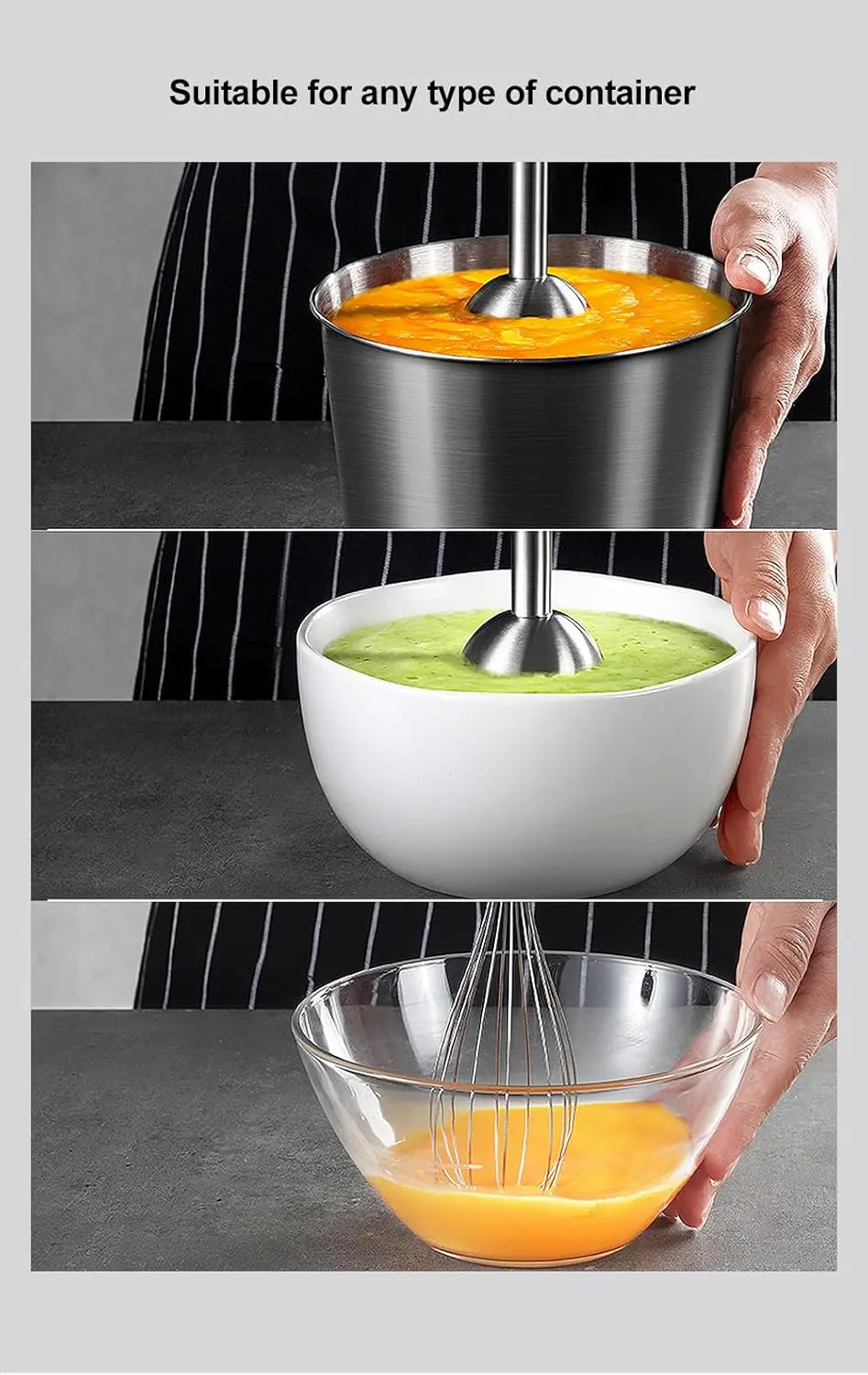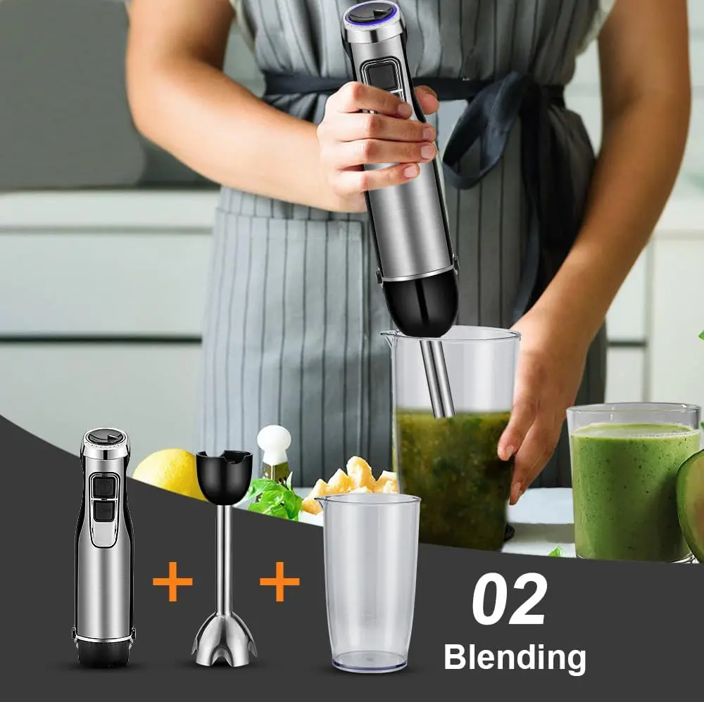 این مخلوطکن دستی ۴ کاره مجهز به موتور مسی سنگین ۱۱۰۰ وات است که قدرت بالا و صدای کمی دارد. این ست شامل تمام ابزارهای مورد نیاز آشپزی است: یک پایه استیل ضد زنگ برای سوپ و سس، یک سری همزن برای کیک و تخممرغ، یک ظرف خردکن ۵۰۰ میلیلیتری برای سبزیجات و آجیل، و یک لیوان مدرج ۸۰۰ میلیلیتری برای اسموتیها. تیغههای این دستگاه از استیل ضد زنگ با کیفیت بالا ساخته شدهاند که بسیار تیز و بادوام هستند. دسته ارگونومیک آن استفاده را راحت کرده و قطعات جدا شونده آن قابل شستشو در ماشین ظرفشویی و کاملاً بدون مواد مضر (BPA-free) هستند.