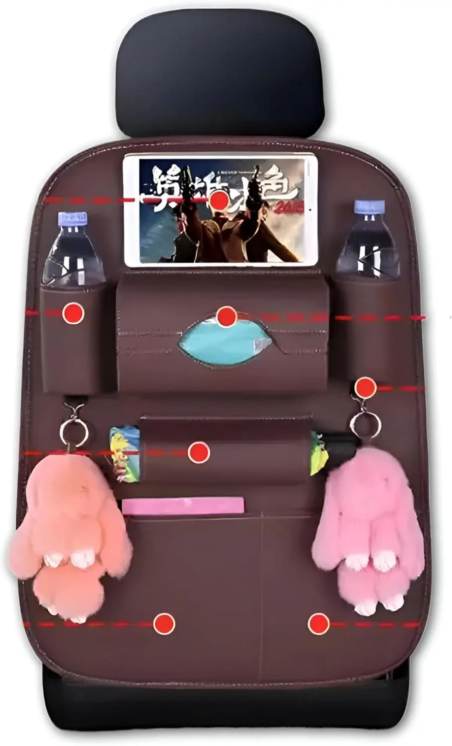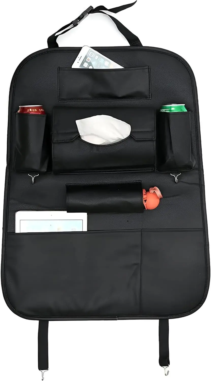 بدنه این محصول از چرم مصنوعی باکیفیت و بسیار مقاوم ساخته شده است که در برابر سایش دوام بالایی دارد و به راحتی با یک دستمال مرطوب قابل شستوشو و پاککاری میباشد. این نظمدهنده دارای جیبهای متعدد و کاربردی در اندازههای مختلف است که شامل جای مخصوص تبلت برای تماشای ویدیو، دو جای بوتل آب در طرفین و یک بخش اختصاصی برای جعبه دستمال کاغذی در قسمت مرکزی میشود. نصب این وسیله بر روی پشت چوکیهای جلو بسیار آسان و سریع بوده و با بندهای مستحکم به خوبی فیکس میشود تا در تکانهای شدید موتر ثابت بماند و از چوکی موتر شما در برابر لکه و خراشیدگی نیز محافظت نماید.