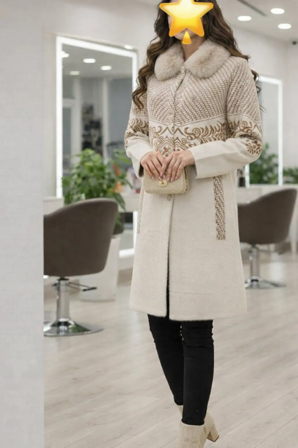 این پالتوی مجلل با رنگ کرم روشن و گرم، شاهکاری از ترکیب هنر سنتی و مد مدرن است که برای بانوانی با سلیقه منحصربه‌فرد طراحی شده تا در سردترین روزهای سال، حسی از شکوه و گرمای بی‌نظیر را به طور همزمان تجربه کنند؛ استفاده از طرح‌های ظریف اسلیمی و حاشیه‌دوزی‌های هنرمندانه در قسمت بالاتنه و جیب‌ها، جلوه‌ای اشرافی و باوقار به این اثر بخشیده است که با یقه خزدار پرپشت و نرم تکمیل شده تا شما در هر محفلی به عنوان نمادی از خوش‌پوشی و تجمل شناخته شوید و علاوه بر آن، بهره‌گیری از پارچه باکیفیت و بافت منسجم در تولید این محصول، محافظتی کامل در برابر سرما فراهم آورده و تجربه‌ای بی‌نظیر از راحتی و شکوه را در تمام طول روز برای شما به ارمغان می‌آورد.