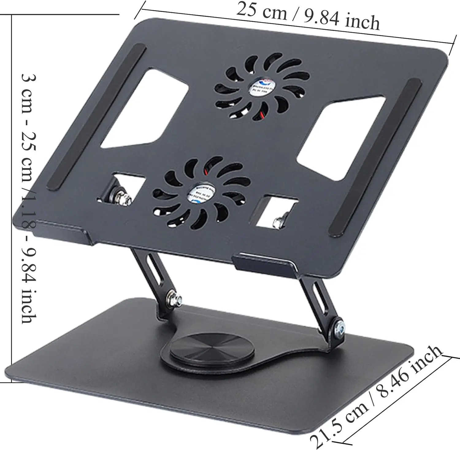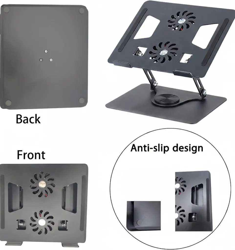 این پایه از فلز بسیار باکیفیت و مستحکم ساخته شده است که پایداری دستگاه شما را به خوبی تضمین میکند. ابعاد قسمت بالایی آن ۲۵ در ۲۲.۲ سانتیمتر و ابعاد پایه نگهدارنده ۲۳.۴ در ۱۸.۵ سانتیمتر میباشد که فضای کافی را برای اکثر لپتاپها فراهم میسازد. مجهز بودن به دو پکه (فن) خنککننده قوی که از طریق کیبل USB تغذیه میشوند، تهویه فوقالعادهای را برای دستگاه به ارمغان میآورد. یکی از ویژگیهای منحصربهفرد این محصول، طراحی چرخدار در قسمت زیرین آن است که قابلیت چرخش ۳۶۰ درجه را فراهم میکند، همچنین استفاده از مواد ضدلغزش (Anti-slip design) در نقاط حساس، مانع از حرکت ناخواسته یا خراشیدگی بدنه لپتاپ شما میشود.