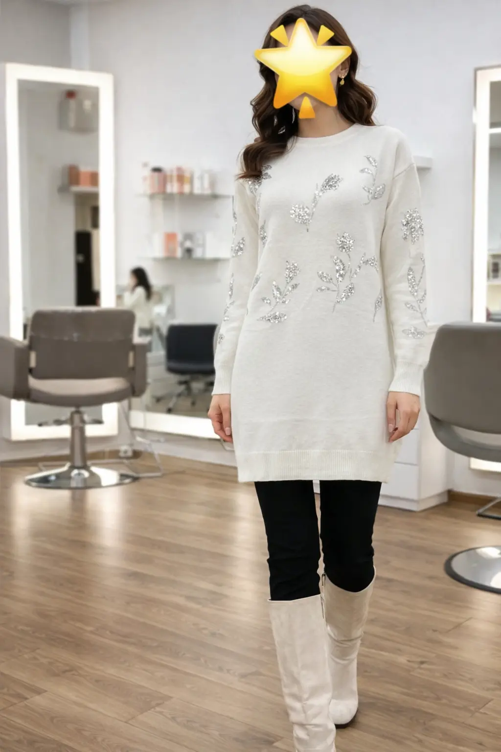 این پیراهن بافت ظریف با رنگ سفید استخوانی، نمادی از پاکی و درخشش در طراحی مدرن است که با هدف ایجاد حسی از لطافت و تجمل برای بانوانی با سلیقه‌ی خاص در فصول سرد سال طراحی گردیده است؛ وجود طرح‌های اسلیمی و گل‌های کار شده با پولک‌های نقره‌ای بر روی متن پارچه، تضادی ملایم و چشم‌نواز ایجاد می‌کند که در کنار بافت نرم و گرم لباس، استایلی لوکس را به شما هدیه می‌دهد تا در هر مناسبتی به زیبایی بدرخشید و علاوه بر آن، این پوشش با بهره‌گیری از الیاف مرغوب، علاوه بر حفظ گرمای مطلوب، تنفسی ایده‌آل برای پوست فراهم می‌آورد که تجربه‌ای بی‌نظیر از راحتی و شکوه را در تمام طول روز برای شما به ارمغان می‌آورد و جایگاهی ویژه در کمد لباس‌های زمستانی شما خواهد داشت.