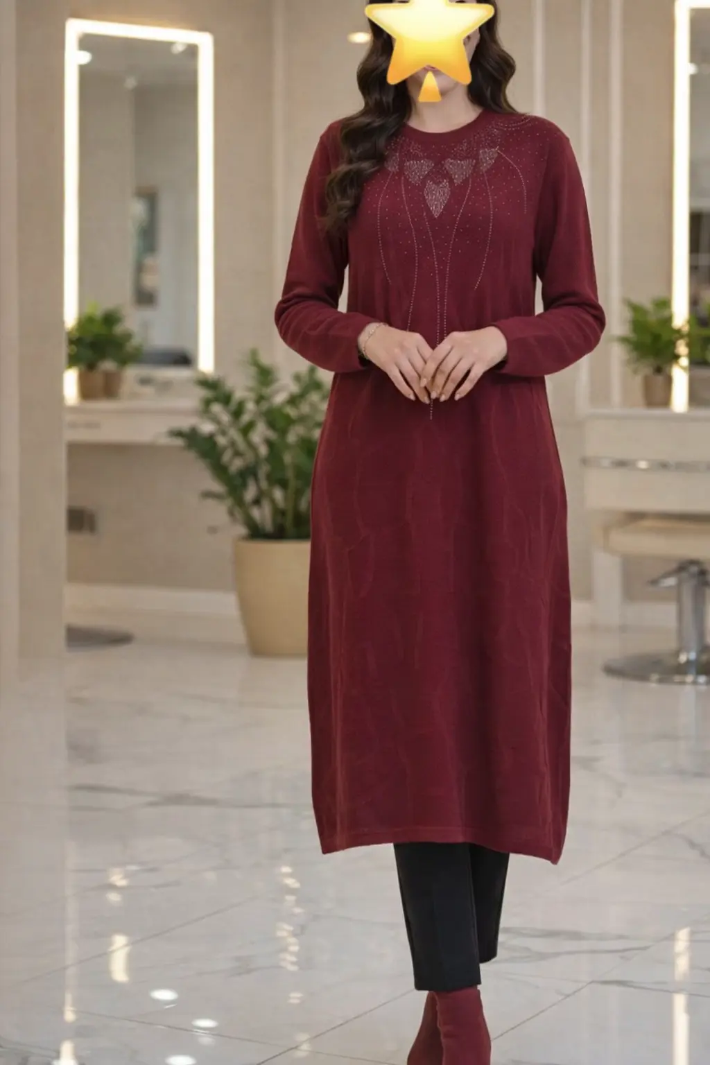 این پیراهن تک‌تکه مجلل با رنگ زرشکی عمیق و با شکوه، مظهر وقار و زیبایی در طراحی مدرن لباس‌های بافتنی است که با هدف خلق استایلی منسجم و با اصالت برای بانوانی با سلیقه خاص طراحی گردیده است؛ نقوش ظریف نگین‌دوزی شده در قسمت سینه که با طرح‌های اصیل اسلیمی آراسته شده، در کنار بافت محو و هنری کل بدنه، جلوه‌ای اشرافی و منحصر‌به‌فرد به این اثر بخشیده است تا شما در هر محفلی به عنوان نمادی از خوش‌پوشی شناخته شوید. علاوه بر آن، این پوشش با بهره‌گیری از بافت متراکم و الیاف مرغوب، علاوه بر حفظ گرمای مطلوب در روزهای سرد، تن‌پوشی بسیار سبک و لطیف را فراهم می‌آورد که در تمام طول روز حسی از اعتماد به نفس و آرامش را به شما منتقل کرده و به یکی از محبوب‌ترین قطعات کمد لباس‌های لوکس شما تبدیل خواهد شد.