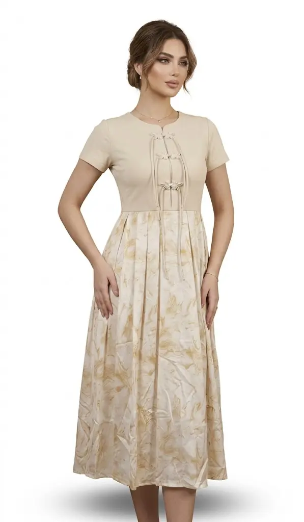 در این لباس شیک، پارچه نخی بسیار مرغوب و سبک به کار رفته است که راحتی فوق العاده ای را در روزهای گرم فراهم می آورد. قسمت بالاتنه و سینه لباس دارای گلدوزی های پرکار و متقارن به رنگ طلایی و مشکی است که جلوه ای نیمه رسمی و آراسته به آن بخشیده است. قد این پیراهن تا روی مچ پا ادامه دارد و با آستین های کامل و یقه گرد ساده، مجموعهای کامل، خنک و باوقار را برای بانوانی که به دنبال راحتی و زیبایی هم زمان هستند، تکمیل می نماید.