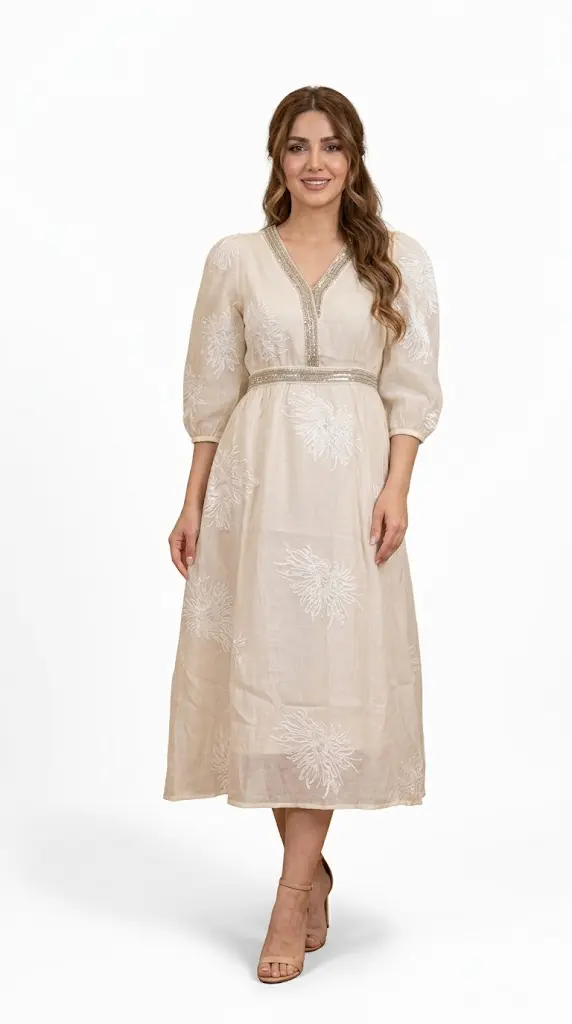 در این لباس شیک، پارچه نخی بسیار مرغوب و سبک به کار رفته است که با الگوهای منظم و اسلیمی در تمام سطح لباس تزیین شده است. آستین های بلند و یقه گرد ساده این مدل، پوششی کامل و در عین حال آراسته ایجاد کرده و قسمت کمر آن با کش دوزی ظریف طراحی شده است تا فرم اندام را به شکلی هنرمندانه برجسته سازد. قد بلند این پیراهن که تا روی مچ پا ادامه دارد، در کنار ریزش زیبای پارچه، مجموعه ای کامل و باوقار را برای بانوانی که به دنبال راحتی و زیبایی هم زمان هستند، تکمیل می نماید.