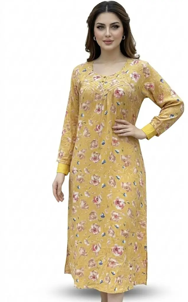 این پیراهن با رنگ زرد روشن و نقش و نگارهای گلدار صورتی، حسی از شادابی و طراوت بهاره را به استایل شما هدیه می دهد. این لباس فری سایز بوده و برای خانم های با حداقل قد ۱۶۵ سانتی متر بسیار مناسب است و به دلیل طراحی هوشمندانه، جلوه ای بلندقامت و باوقار به ظاهر شما می بخشد. طراحی آزاد و قد بلند این لباس در کنار رنگ گرم و دلنشین آن، ترکیبی ایده آل برای استفاده در محیط های خانگی و دورهمی های دوستانه فراهم کرده است.