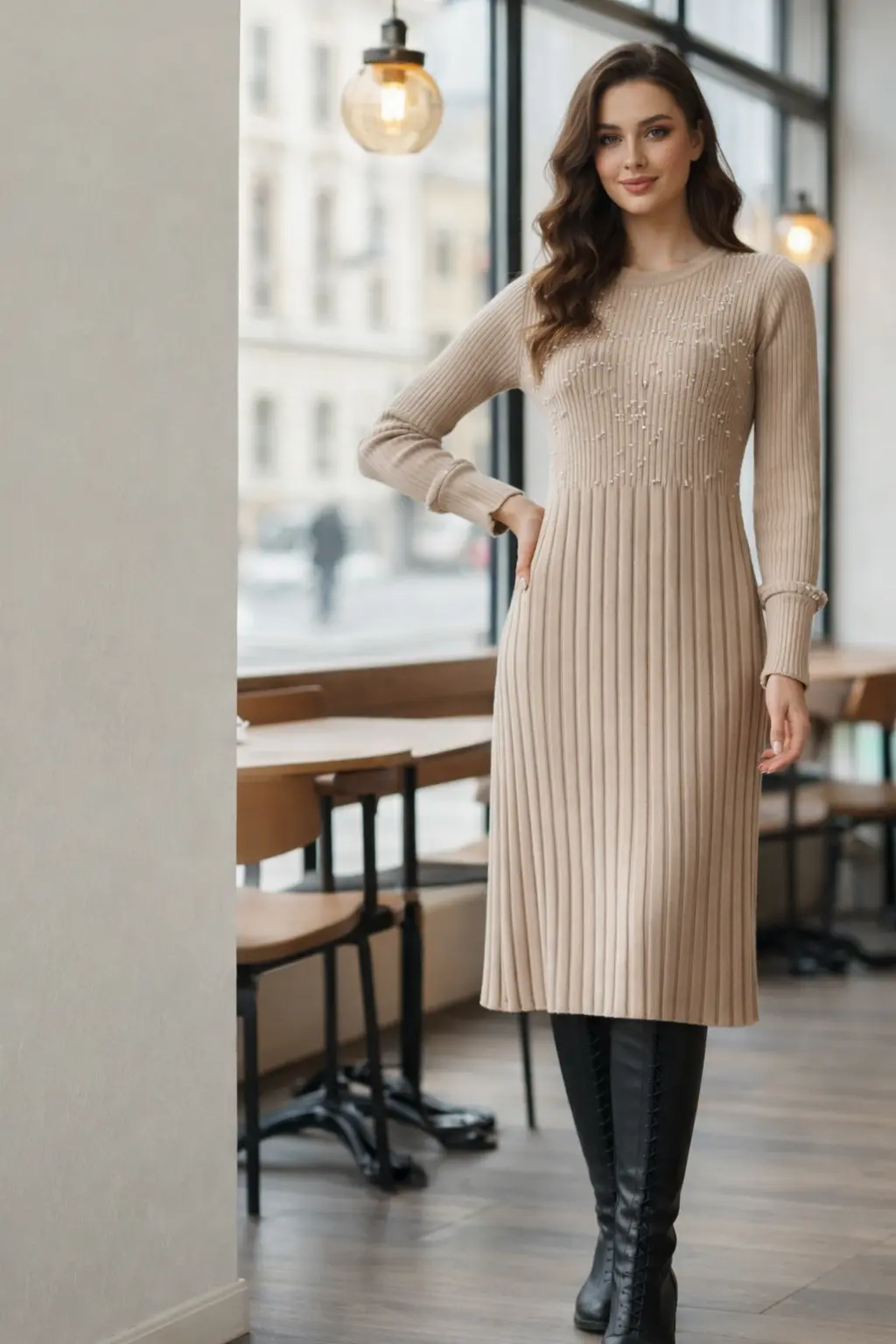 این پیراهن جاکتی زنانه با بافت منظم و فرم راسته، انتخابی شیک و قابل اعتماد برای بانوانی است که به استایل مرتب، زنانه و امروزی اهمیت میدهند و بهدنبال لباسی هستند که در عین سادگی، جلوهای ظریف و چشمنواز داشته باشد. بافت پلیسهای یکدست در بخش پایینی لباس، ظاهری کشیده و متعادل ایجاد میکند و جزئیات لطیف بخش بالاتنه، حس ظرافت و وقار را تقویت مینماید، بهگونهای که این مدل هم برای استفاده روزمره مناسب است و هم در موقعیتهای نیمهرسمی ظاهری آراسته، گرم و قابل اعتماد ارائه میدهد.