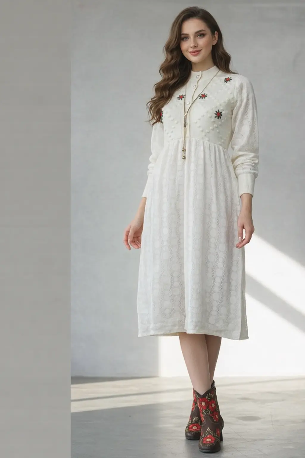 این پیراهن زنانه خامک‌دوزی با طراحی ظریف و فرم راسته، انتخابی شیک و دلنشین برای بانوانی است که به استایل لطیف، زنانه و آرام اهمیت می‌دهند و ترجیح می‌دهند لباسی را انتخاب کنند که در عین سادگی، جلوه‌ای خاص و اصیل داشته باشد. ترکیب پارچه روشن با جزئیات خامک‌دوزی ظریف در بخش بالاتنه، ظاهری متعادل و چشم‌نواز ایجاد می‌کند و باعث می‌شود این مدل هم برای استفاده روزمره مناسب باشد و هم در موقعیت‌های نیمه‌رسمی ظاهری آراسته، تمیز و قابل اعتماد ارائه دهد، به‌گونه‌ای که به‌راحتی با بوت یا کفش‌های ساده ست شده و استایلی هماهنگ و زنانه را کامل می‌کند.