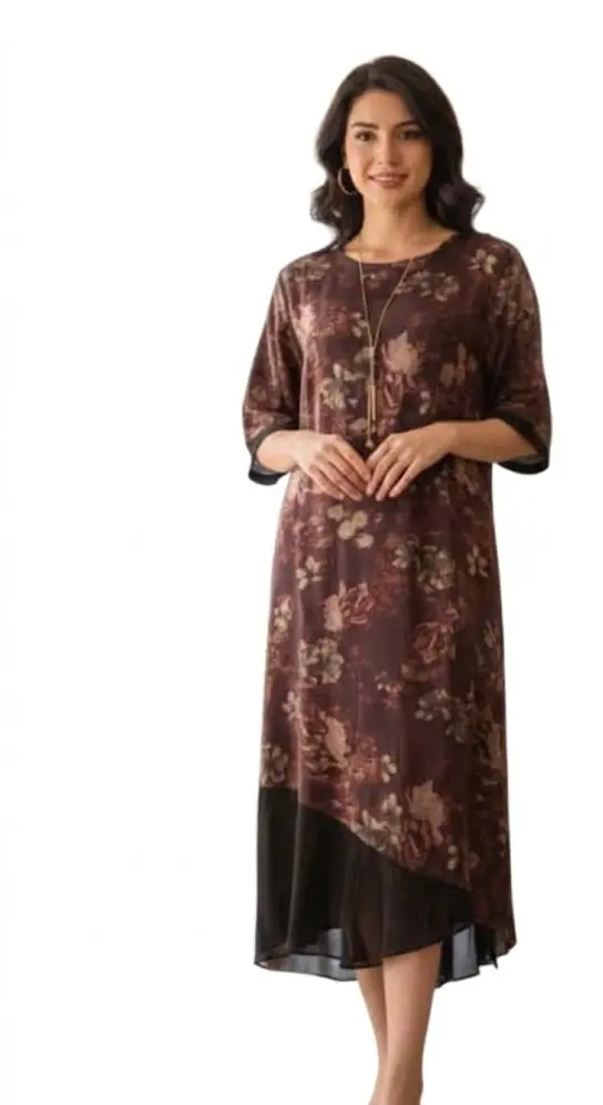 این پیراهن با طیف رنگی قهوه ای سوخته و نقش و نگار گل های پاییزی، حسی از گرما و صمیمیت را به استایل شما اضافه می کند. این لباس فری سایز بوده و برای خانم های با حداقل قد ۱۶۵ سانتی متر بسیار مناسب است و به دلیل طراحی هوشمندانه، جلوه ای بلندقامت و باوقار به ظاهر شما می بخشد. برش کلوش و نامتقارن در قسمت پایین لباس که با یک لایه حریر مشکی تکمیل شده، تضادی جذاب ایجاد کرده است که برای استفاده در روزمرگی ها و مهمانی های دوستانه انتخابی عالی به شمار می رود.