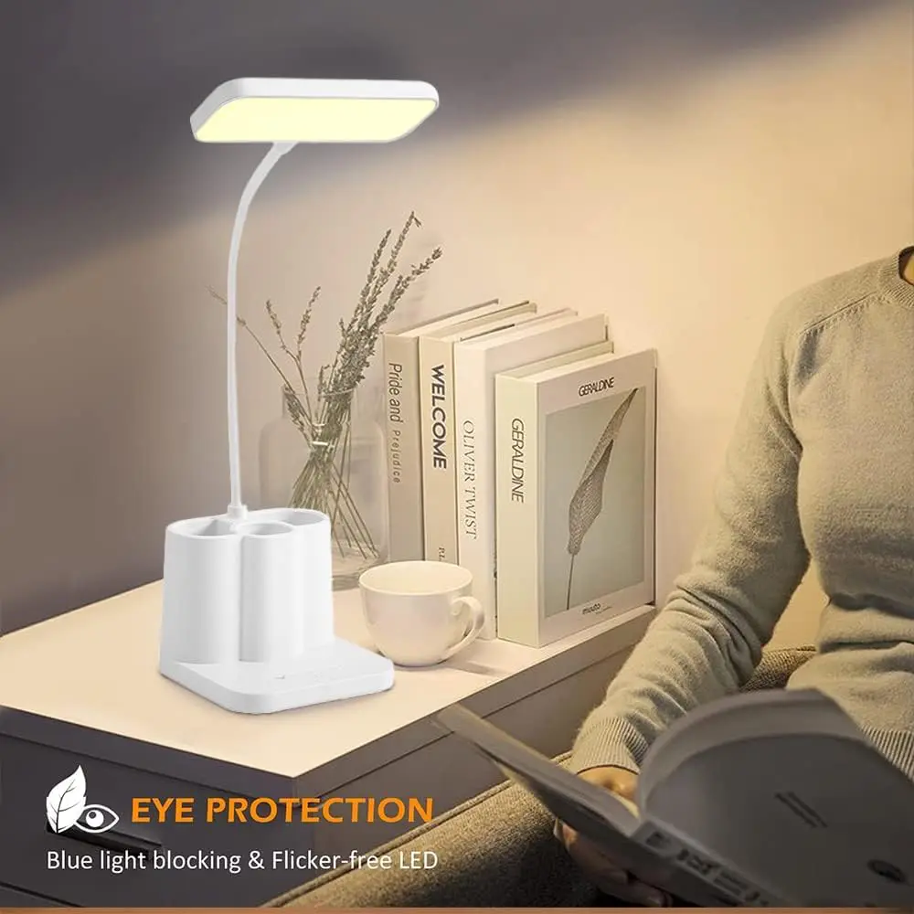 طراحی مینیمال و رنگ سفید مات این محصول، حسی از آرامش و پاکیزگی را به فضای اتاق خواب یا دفتر کار شما میبخشد. گردن این چراغ از نوع انعطافپذیر (Flexible Gooseneck) است که قابلیت چرخش ۳۶۰ درجه دارد؛ این ویژگی به شما اجازه میدهد نور را دقیقاً روی نقطه مورد نظر کتاب یا دفتر خود متمرکز کنید. یکی از کاربردیترین ویژگیهای این مدل، شیار مخصوص موبایل است؛ تصور کنید در حال دیدن یک ویدیو آموزشی آنلاین یا برقراری تماس تصویری با دوستانتان هستید و همزمان نیاز به نور کافی و یادداشتبرداری دارید؛ این دستگاه هم گوشی را برایتان نگه میدارد، هم نور را تامین میکند و هم خودکار را در دسترستان قرار میدهد. این یعنی تمرکز بیشتر و آشفتگی کمتر بر روی میز شما.