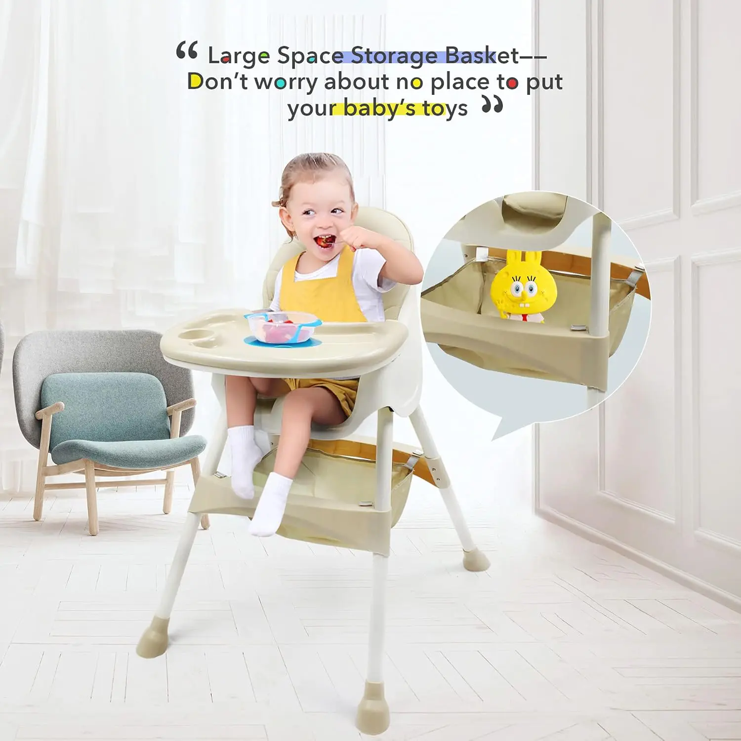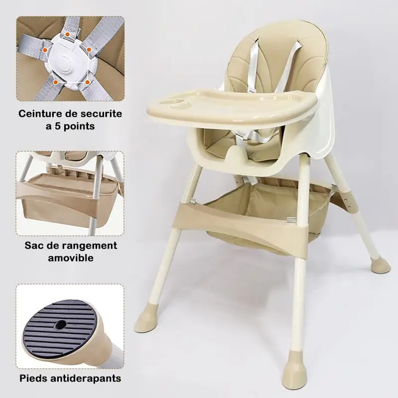 این چوکی دارای یک میز محافظ جلو با جای مخصوص گیلاس است که به راحتی قابلیت شستشو دارد. برای امنیت بیشتر طفل، کمربند ایمنی مستحکمی در نظر گرفته شده و پایه‌ها مجهز به استوپ‌های ضد لغزش هستند. در قسمت زیرین حالت پایه بلند، یک سبد توری جادار برای قرار دادن دستمال یا وسایل طفل تعبیه شده است. تشک این محصول از مواد نرم و باکیفیت ساخته شده که به راحتی پاک می‌شود و فریم فلزی آن استحکام و دوام طولانی‌مدت را تضمین می‌کند.