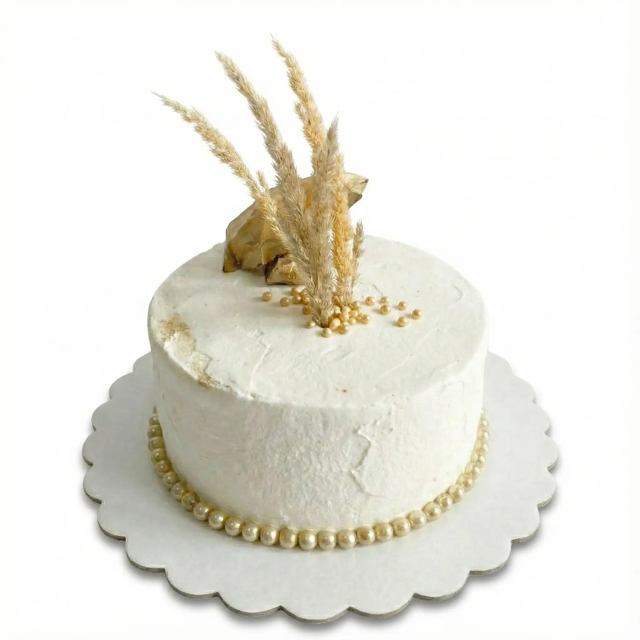 زیبایی طبیعت و سادگی را با کیک "خوشه طلایی و مروارید" در آغوش بگیرید. این طراحی بوهو-شیک دارای ظاهری سفید و مینیمال است که با حاشیهای از مرواریدهای طلایی، خوشههای گندم خشک و یک سنگ تزیینی طلایی هندسی آراسته شده است. این کیکها به وزنهای دلخواه شما تهیه میشوند. کریمی و خامهای. کریمی فی کیلو ۲۵۰ افغانی و خامهای ۳۵۰ افغانی میباشد. این یک انتخاب خاص و باوقار برای کسانی است که زیبایی را در جزئیات ساده میبینند.