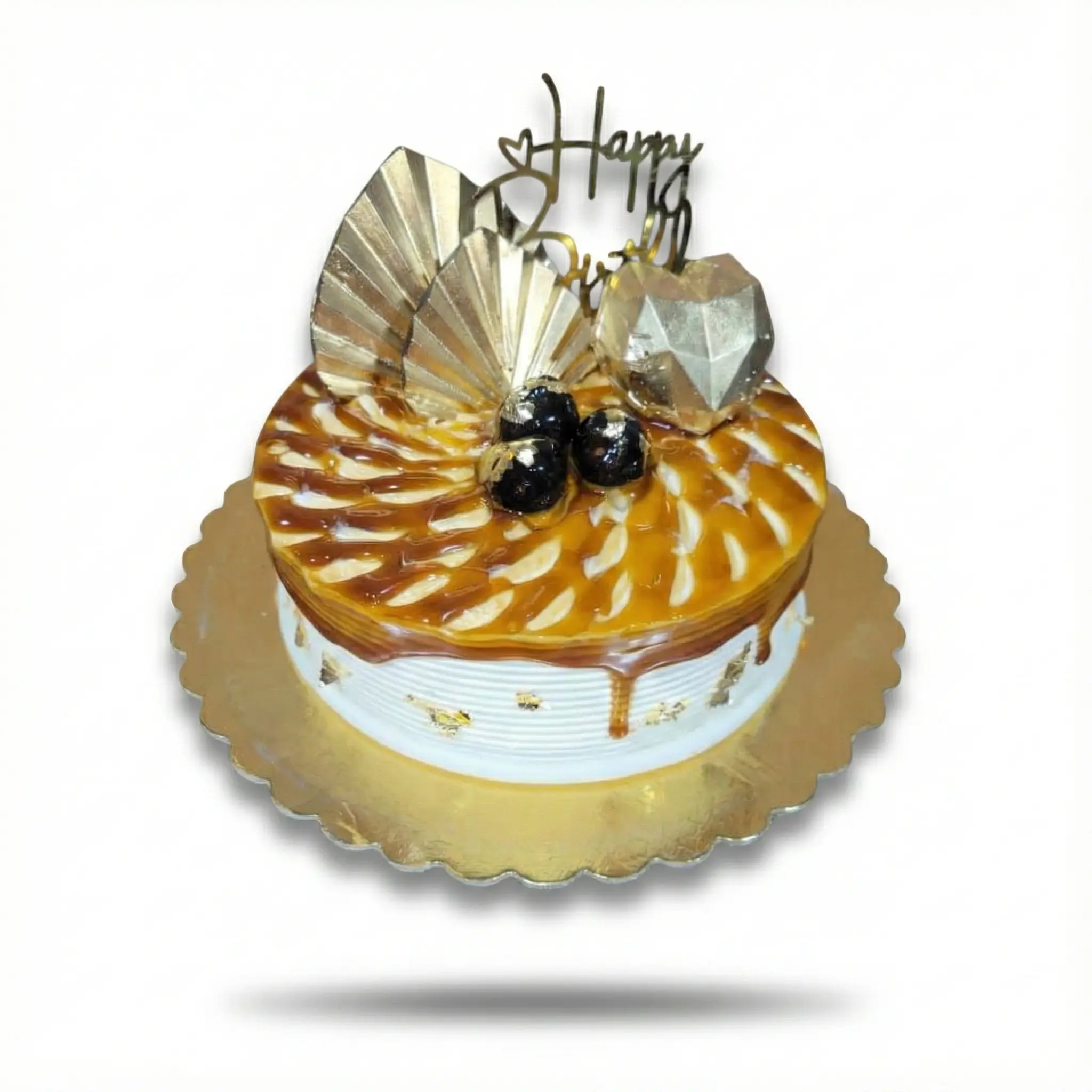 جشن خود را با کیک لوکس "کاراملی با قلب و بادبزن طلایی" درخشان کنید. این اثر هنری زیبا دارای طرح ابر و بادی کاراملی و خامهای در رویه است که با بادبزنهای طلایی شیک، یک قلب هندسی طلایی سه بعدی و ترافلهای شکلات تلخ تاجگذاری شده است. این کیکها به وزنهای دلخواه شما تهیه میشوند. کریمی و خامهای. کریمی فی کیلو ۲۵۰ افغانی و خامهای ۳۵۰ افغانی میباشد. با تزیینات ورق طلا در دیوارهها و تاپر "تولدت مبارک"، این بهترین انتخاب برای یک جشن تولد باکلاس است.