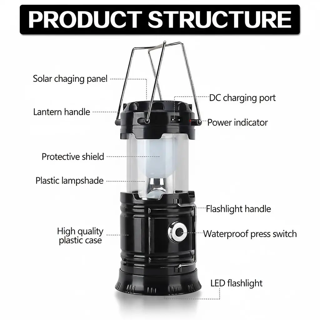 طراحی این محصول به گونه‌ای است که هم به عنوان یک چراغ دستی برای پیاده‌روی در شب کاربرد دارد و هم به عنوان یک چراغ رومیزی یا آویز برای روشن کردن کل فضای اتاق یا چادر مسافرتی. مکانیزم روشن شدن آن احتمالاً به صورت کشویی است؛ یعنی با بالا کشیدن بدنه، لامپ‌های LED پرقدرت روشن می‌شوند و با بستن آن، خاموش شده و فضای کمتری اشغال می‌کند. دسته‌های فلزی تعبیه شده روی بدنه به شما اجازه می‌دهند آن را به راحتی حمل کنید یا از شاخه درخت و سقف آویزان نمایید. بدنه پلاستیکی مقاوم با ظاهر براق، علاوه بر زیبایی، دوام بالایی در برابر ضربه دارد. این فانوس مدرن، ترکیبی از نوستالژی چراغ‌های قدیمی و کارایی تکنولوژی سولار امروزی است.