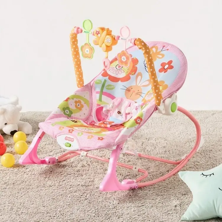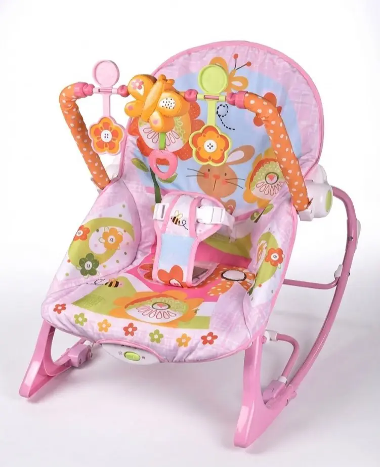 وقتی کودک را در این صندلی نرم و رنگارنگ قرار میدهید، طرحهای شاد پارچه و اسباببازیهای آویزان (مثل پروانه و گل) فوراً توجه او را جلب میکنند. این نوار اسباببازی که بالای سر کودک قرار دارد، نه تنها او را سرگرم میکند، بلکه به تقویت بینایی و مهارتهای حرکتی دست او نیز کمک میکند. کمربند ایمنی سه نقطهای با پوشش نرم، خیال شما را از بابت امنیت کودک راحت میکند، حتی زمانی که صندلی در حال تکان خوردن است. بدنه صورتی و پایههای منحنی این محصول طوری طراحی شدهاند که تعادل کاملی داشته باشند و واژگون نشوند. این گهواره سبک و قابل حمل است، پس میتوانید آن را به راحتی از اتاق خواب به پذیرایی یا حتی حیاط ببرید تا کودکتان همیشه در کنارتان باشد، چه در حال بازی و چه در حال چرت زدن.